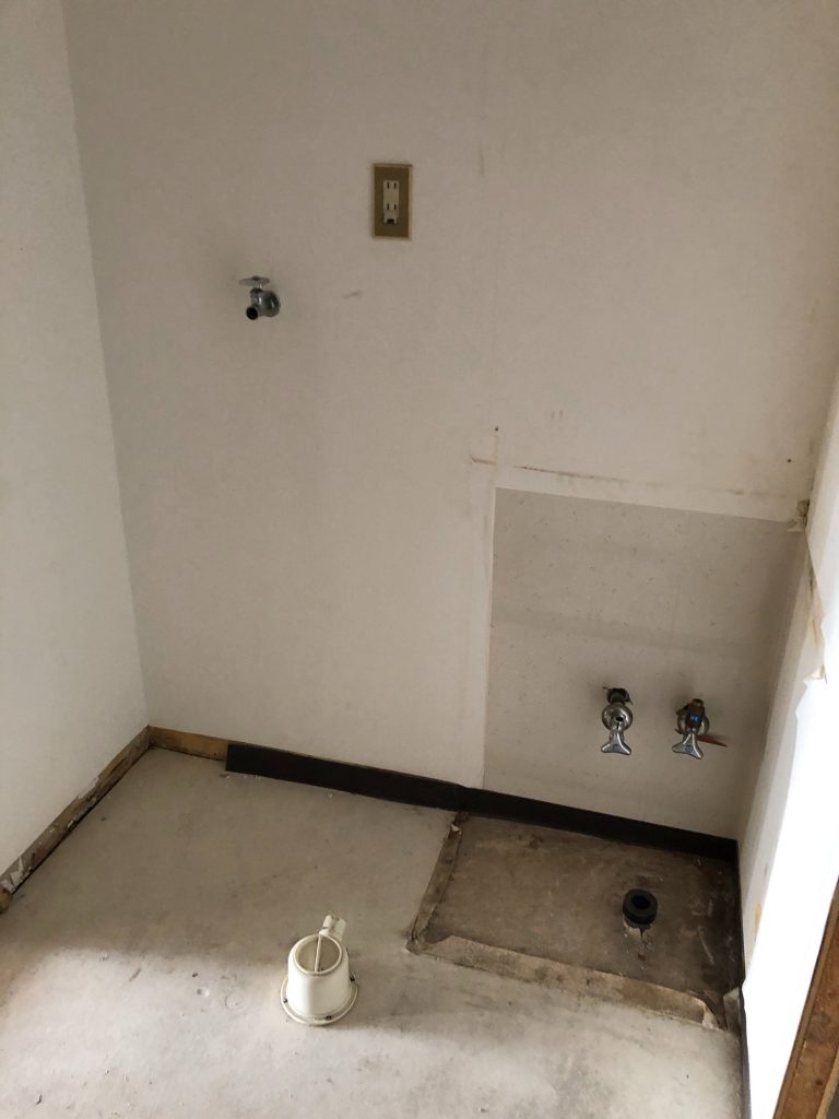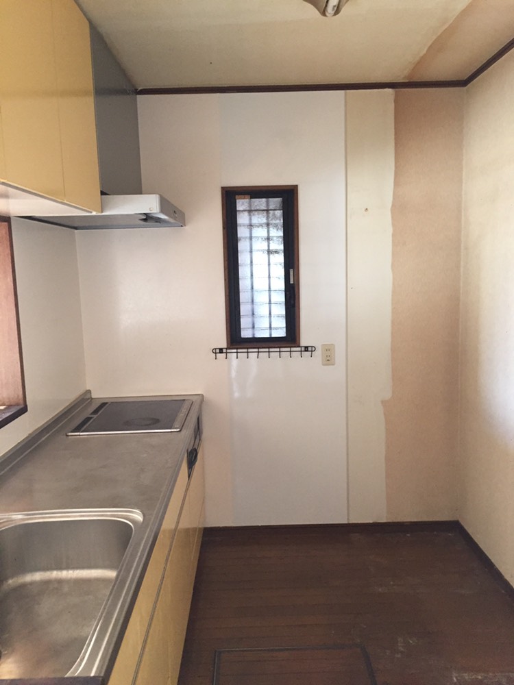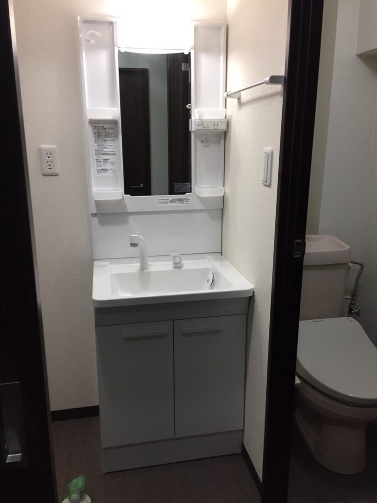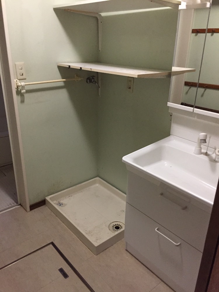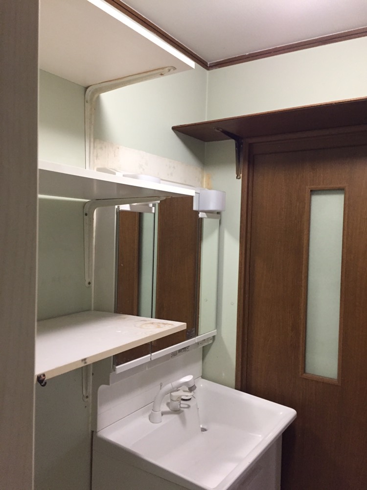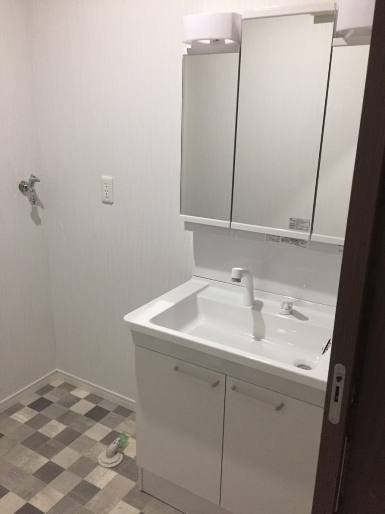 造作してクロスとクッションフロアを貼り、洗面台は取替を行いました。